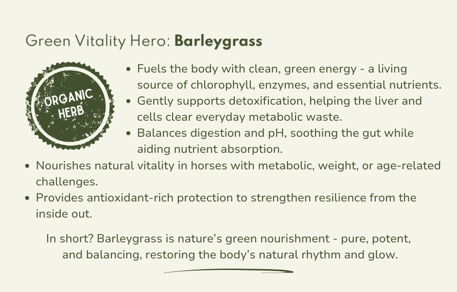 Barleygrass offers broad-spectrum nutritional support - a gentle alkaliser, cellular detoxifier, and metabolic nourisher. Particularly beneficial for horses managing insulin resistance, Cushing’s, or stress-related fatigue, it replenishes at a deep cellular level, delivering restorative, bioavailable vitality without overstimulation.