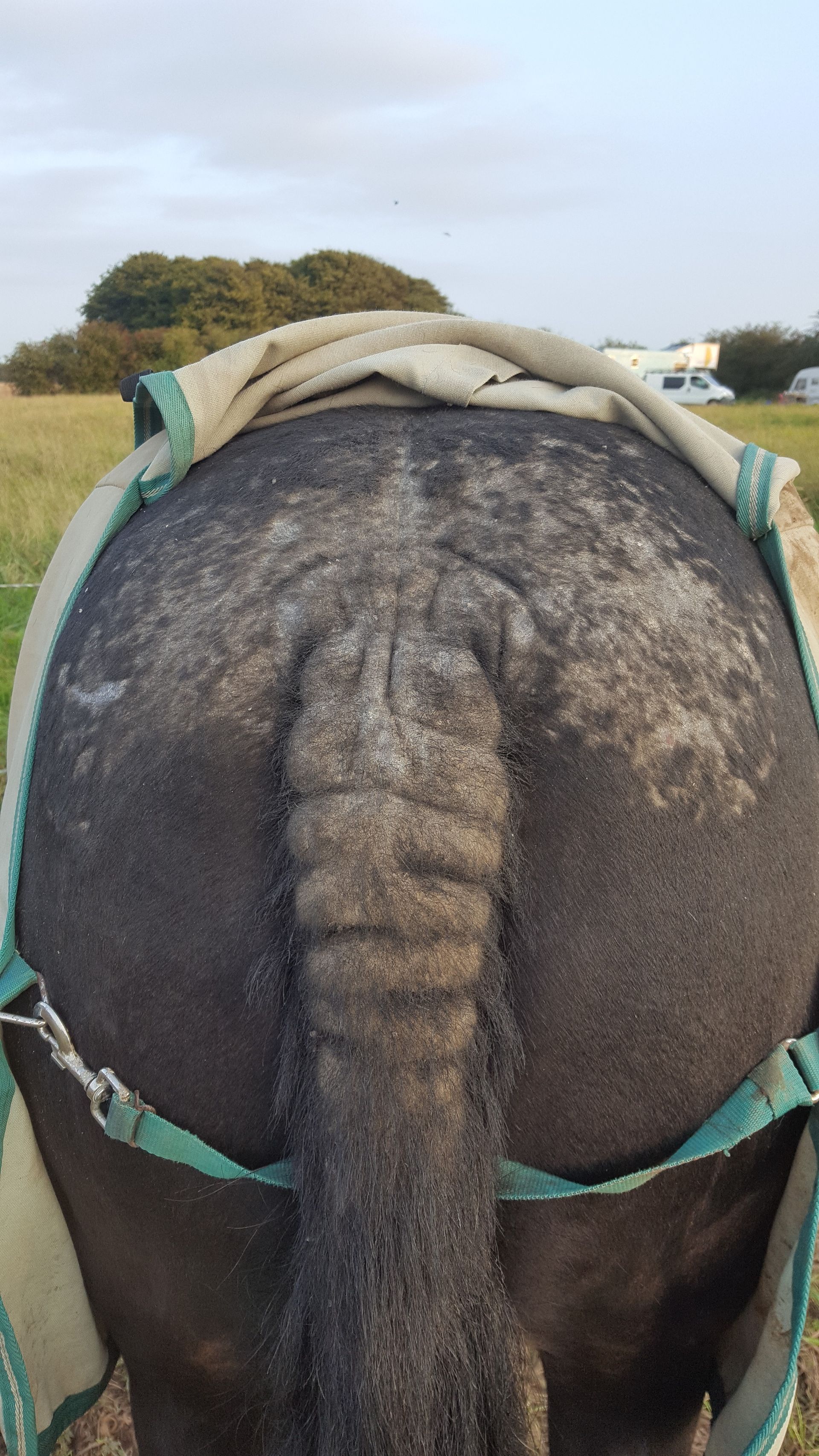 This was the worst sweet itch I’d ever seen, and our Kelso had been the sweet itch king so I thought I knew sweet itch, but this was something else. Huge, deep, open, suppurating wounds, raw and weeping, the size of dinner plates each side of his tail. Just dreadful. I mentioned it gently to YO who sputtered that yes she felt dreadful about it but she had ordered a rug for him, and to be fair it coincidentally arrived that same day.