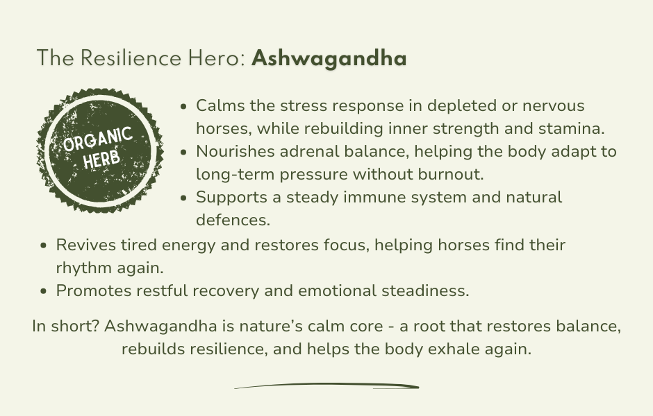 Simply put, ashwagandha is a root for resilience - restoring energy, easing the stress response, and helping both humans and horses find their calm strength again.