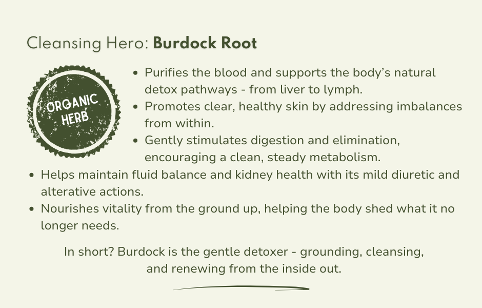 Burdock is a quiet workhorse of the herbal world: humble, steady, and profoundly cleansing.