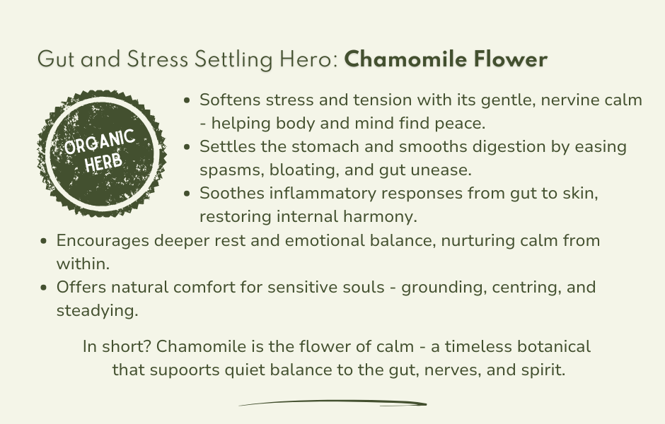 Chamomile might look delicate, but it’s a powerhouse for soothing tension in both gut and mind. Chamomile’s nervine and anti-inflammatory properties gently quieten the stress cascade while easing digestive unrest - restoring calm, balance, and quiet contentment from within.