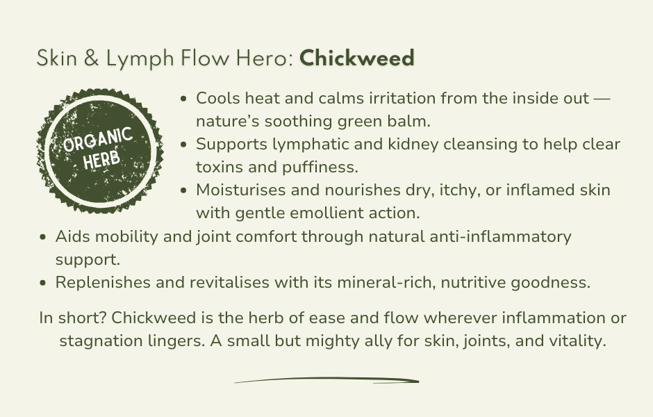 I could go on and on ... In short though, chickweed’s central theme? Lubrication and movement - whether inside or out, it soothes where things are hot, dry, stuck, or inflamed. It's a cracking little herb, and I for one get very excited when I see it growing!