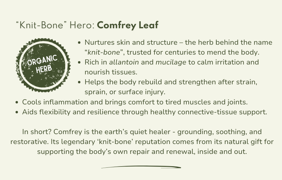 Comfrey, the legendary ‘knit-bone’ herb, has been trusted for over 2,000 years to soothe, restore, and help the body repair itself.