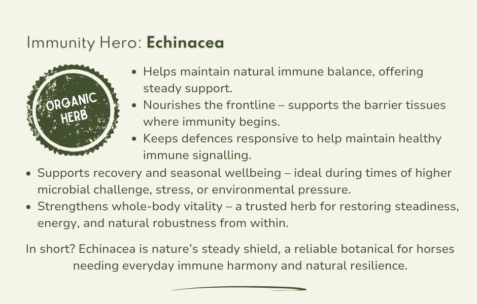 Echinacea is a gentle, widely used herb that supports normal immune balance and resilience, and most horses tolerate it very well. However, it's not suitable for pregnant mares, or horses on immune-suppressing medications without veterinary advice.