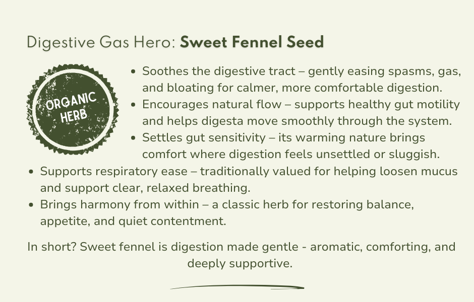 Naturally carminative and lightly warming, fennel helps the digestive system relax and release – making it a calm, kind choice for everyday gut support or periods of digestive sensitivity.