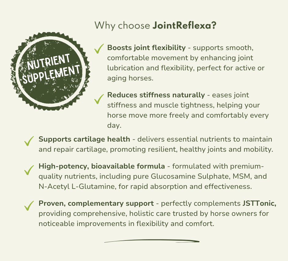 Keep your horse moving comfortably with JointReflexa, a synergistic blend of the highest quality mobility-supporting nutrients in their most bio-available forms.