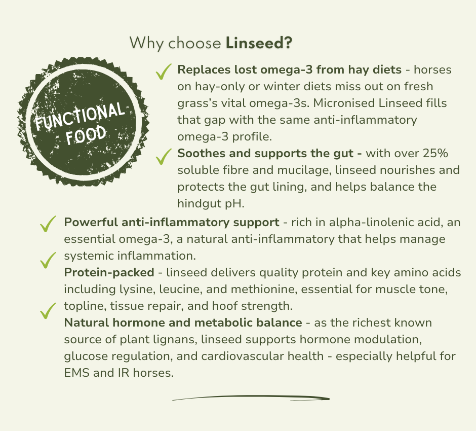 - Did you know? Horses on hay-only diets lack omega-3 fatty acids, which are lost during the drying and baling process. Micronised Linseed fills this gap, providing the same omega-3 profile as fresh grass - perfect for year-round nutrition.