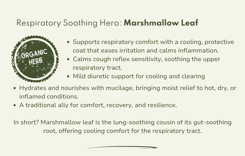 Everyone knows the marshmallow plant has a reputation for softness - from its velvety leaves and delicate flowers to the slippery-smooth mucilage it releases. But while the root is more famous for gut support, the leaf has carved out its own niche as a trusted ally for the lungs and airways.