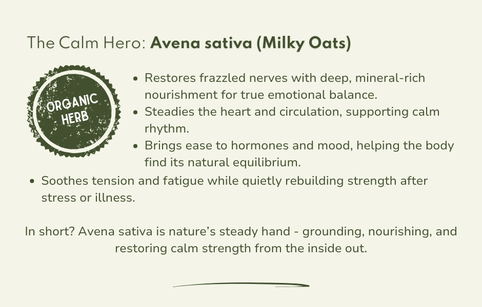 Rich in B vitamins, calcium, magnesium, silica, and trace minerals, oats are considered a deeply nourishing herb. Both milky oats and oatstraw help rebuild and restore tissues, calm frazzled nerves, and support recovery from stress, illness, or emotional strain. Herbalists often recommend milky oats tincture for times of nervous exhaustion, anxiety, or burnout - even to help ease withdrawal from alcohol or drugs.