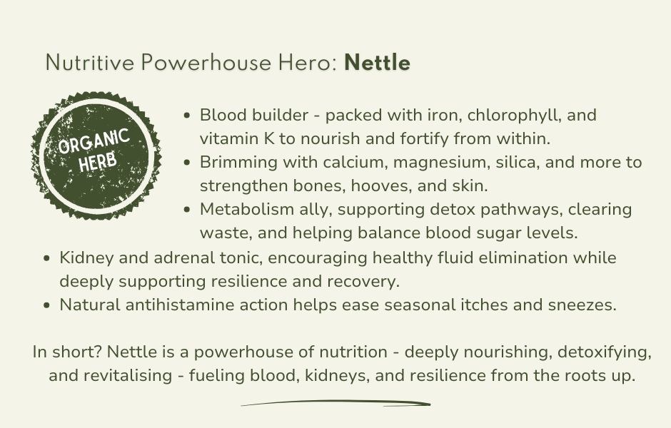 Rich in iron, minerals, and chlorophyll, nettle is a true nourishing powerhouse - supporting vitality, detox pathways, and resilience from root to leaf.