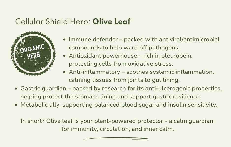 From sacred symbol to science-backed powerhouse, olive leaf is the original healer with ancient roots and modern relevance — a Mediterranean marvel that supports the immune system, heart health, and cellular resilience.