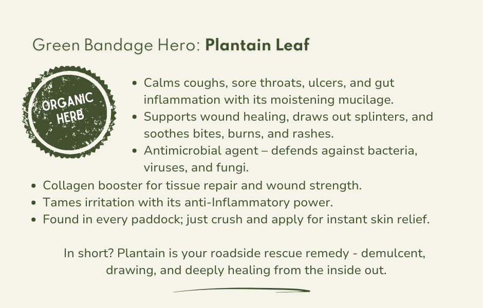 In the hedgerow or in your horse’s field, you’ll likely find Plantago major or Plantago lanceolata(ribwort), both brimming with mucilage and potent healing compounds. Historically, herbalists and indigenous peoples alike have relied on it for drawing out splinters, soothing stings, relieving nettle rash, and cooling inflammation. From insect bites to splinters to sunburn, this was the original green bandage.