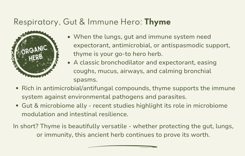 Today, thyme remains one of the most studied antimicrobial herbs, with thymol - its key volatile oil - recognised for potent expectorant, antiseptic, and immune-boosting qualities.